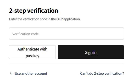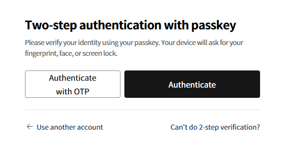 인증 수단으로 OTP와 패스키(Passkey) 중에 선택하여 2단계 인증을 수행할 수 있습니다.