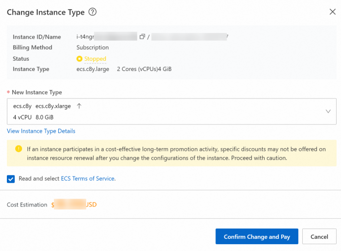 [관련문서] 구독형 ECS 인스턴스의 인스턴스 유형을 업그레이드 또는 다운그레이드합니다.
