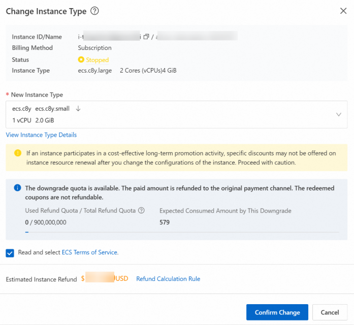 - 변경사항을 확인하고, 읽기를 선택한 다음 ECS 서비스 약관을 선택하고, 인스턴스 중지 및 진행을 클릭합니다.