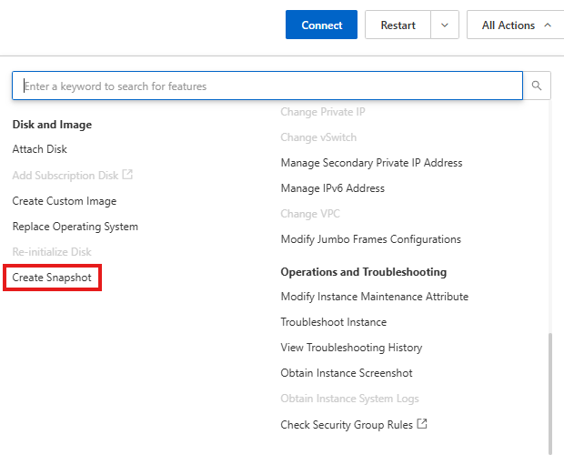 - 페이지 오른쪽 상단에서 All Actions > Disk and Image > Create Snapshot을 선택합니다.