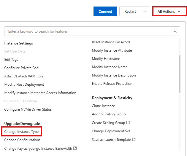 Alibaba Cloud에서는 이를 인스턴스 타입 변경(Change Instance Type) 이라고 부릅니다.