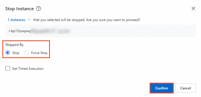 - 인스턴스 중지 대화 상자에서 중지 방법 아래의 중지 방식을 선택하고 확인을 클릭합니다.