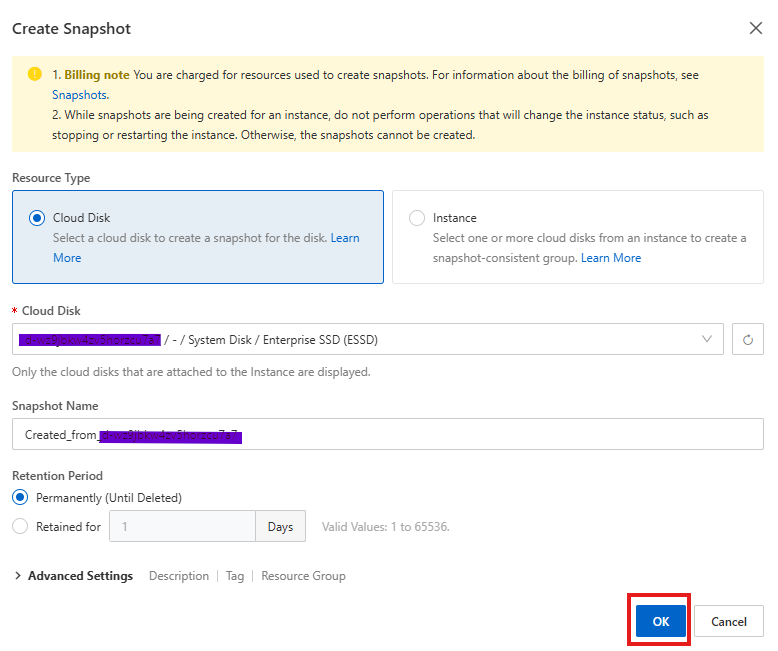 - 스냅샷 생성 팝업페이지에서 스냅샷 생성 원하는 디스크를 선택 후 스냅샷 생성을 시작합니다.