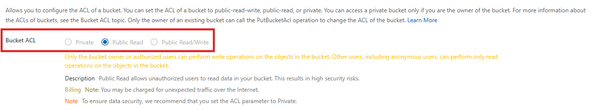 - ACL 항목에서 Bucket ACL을 Public Read로 설정합니다.(Public Read는 버킷 내 객체가 인터넷에 공개될 수 있으므로, 정적 웹 리소스만 두는것을 권장합니다.)