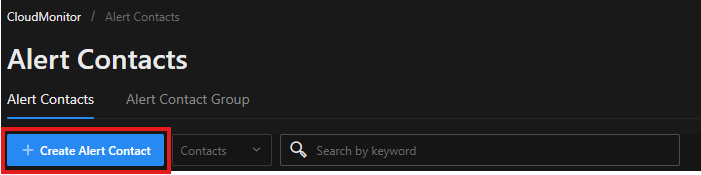 - CloudMonitor > Alerts >Alert Contacts 항목에서 알림 수신자를 먼저 생성합니다.