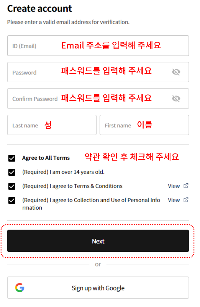 본 가이드에서는 Create account 버튼을 통해 신규 계정을 생성하는 방법을 안내 드리겠습니다.
