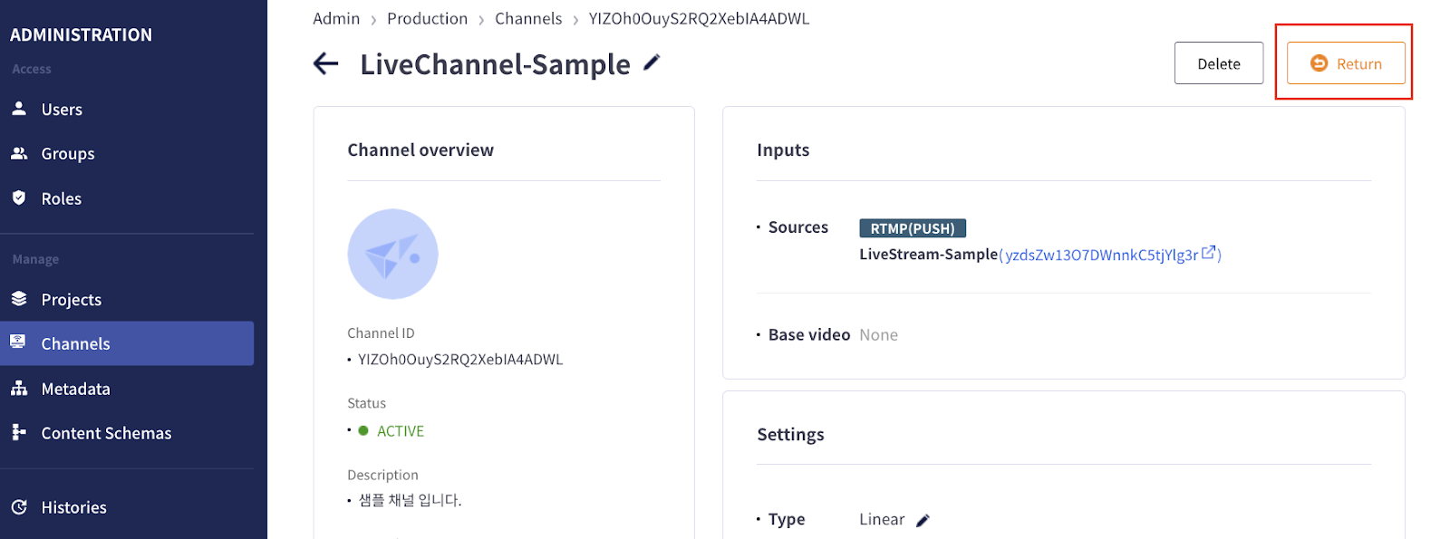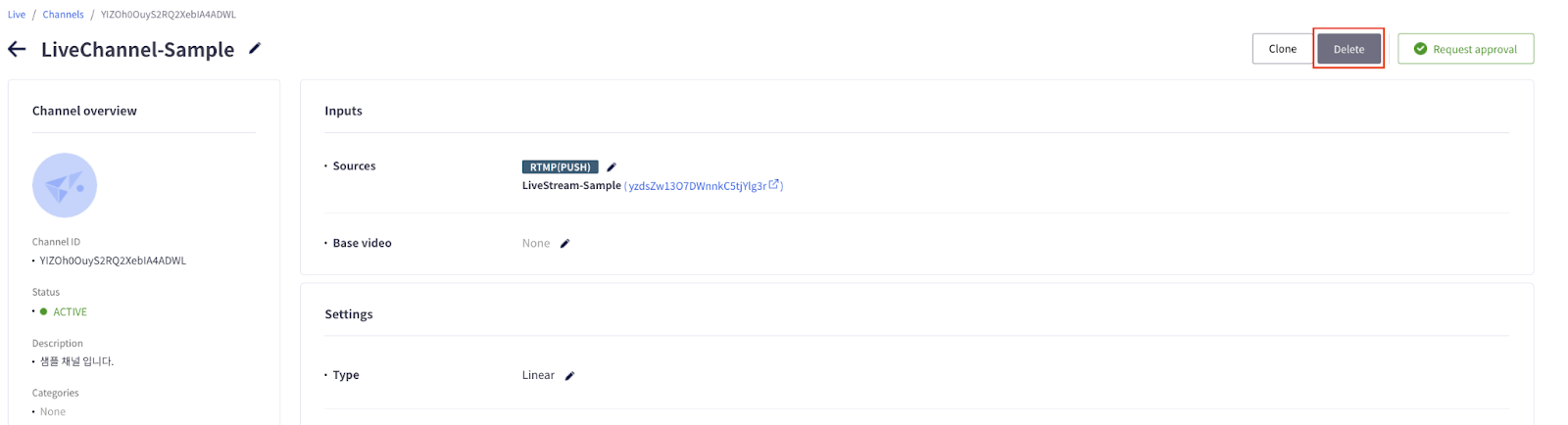 Live Channel을 더 이상 사용하지 않을 경우, Channel 및 Stream을 반환 및 삭제할 수 있습니다.