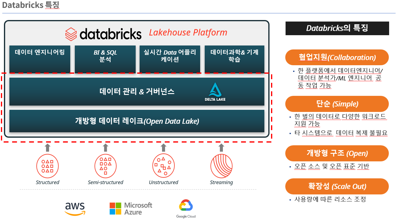 Databricks는 Data Lake와 DW 워크로드를 모두 지원할 수 있는 Lakehouse Platform으로서, 사용이 용이하고 Databricks 플랫폼에서 모든 사용자의 협업을 지원 합니다.