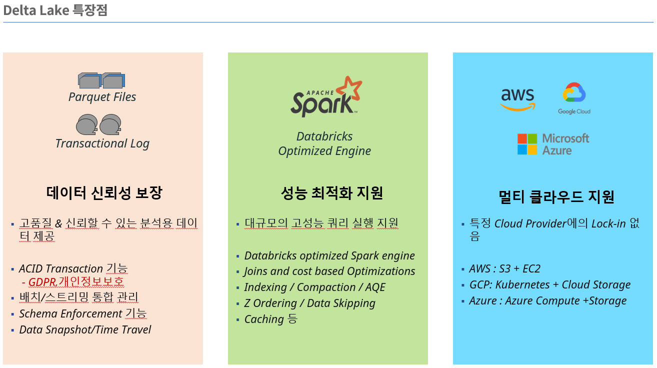 Databricks는 Delta Lake를 사용해 기존 파일 시스템 기반의 Data Lake 대비 1) 데이터 신뢰성 보장, 2) 성능 최적화 지원, 3) 멀티 클라우드 환경을 지원하여 특정 Cloud Provider 에 Lock-in 될 우려가 없는 장점을 보유하고 있습니다.
