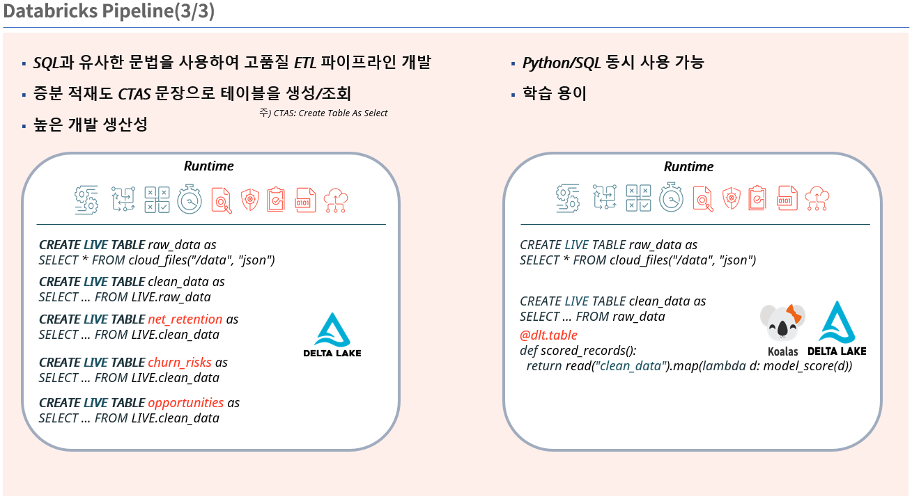 Databricks는 SQL 기반 데이터 처리 기능을 통해 사용자에게 친숙한 환경에서 복잡한 데이터 분석과 처리를 가능하게 합니다. 이를 통해 기업은 고급 데이터 분석을 신속하게 수행하며, 데이터의 가치를 최대한 활용할 수 있습니다. 또한, 복잡한 변환 규칙은 Python을 활용하여 처리합니다.