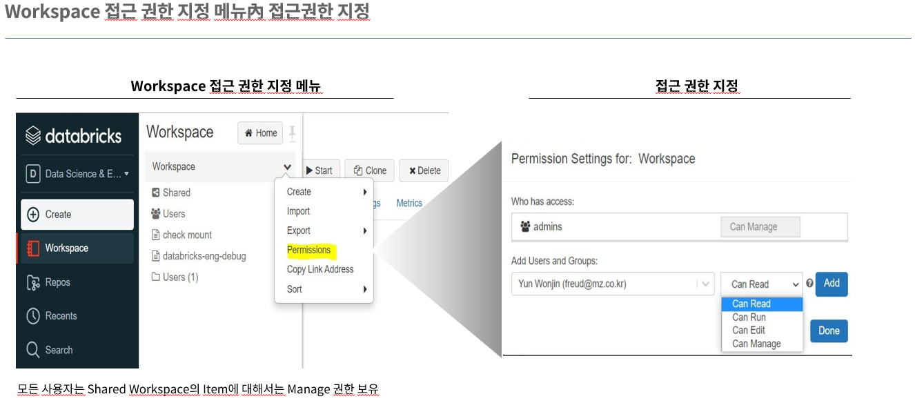 Databricks의 Workspace 접근 권한 관리 기능은 각 사용자와 팀의 역할에 맞춰 세밀한 권한 설정을 가능하게 하여, 데이터 보안과 거버넌스를 강화합니다. 이를 통해 조직은 다양한 프로젝트와 환경에서 필요한 접근성을 조율하고, 데이터 자산을 효과적으로 보호할 수 있습니다.