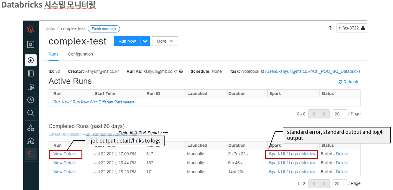 Databricks에서 제공하는 워크플로우 Job 모니터링 기능은 작업의 실행 상태, 성능 지표 및 로그 정보를 상세히 제공하여 효율적인 작업 관리와 문제 해결을 지원합니다. 이를 통해 사용자는 자동화된 데이터 파이프라인의 안정성을 확보하고, Job 성능을 최적화하여 데이터 처리의 신뢰성을 높일 수 있습니다.