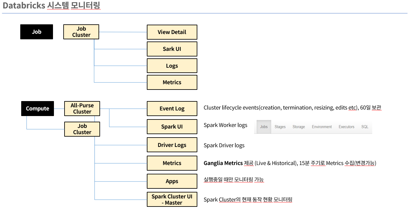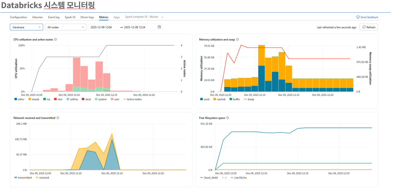 Databricks는 클러스터 모니터링을 통해 실시간 성능 분석 및 자원 사용률 추적을 제공하여 시스템의 최적화와 안정성을 보장합니다. 사용자는 이를 통해 클러스터의 상태를 정밀하게 모니터링하고, 문제 발생 시 신속히 대응하여 시스템 가용성을 높일 수 있습니다.
