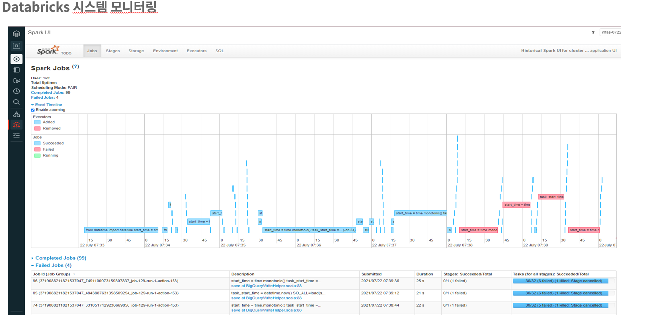 Databricks 노트북 실행결과의 상세 정보를 확인할 수 있어 사용자에게 애플리케이션의 성능, 사용 상태, 그리고 자원 사용에 대한 심층적인 정보를 제공합니다. 이를 통해 사용자는 애플리케이션의 성능을 상세하게 모니터링하고 최적화할 수 있으며, 데이터 기반의 의사결정 과정을 더욱 효율적으로 수행할 수 있습니다.