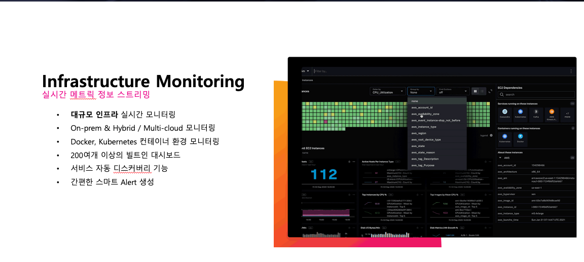 - AWS, Azure, GCP 같은 퍼블릭 클라우드와 쿠버네티스(Kubernetes) 환경의 메트릭을 초 단위(Real-time)로 수집하여 시각화합니다.