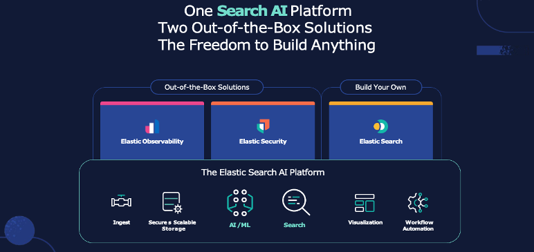 Elastic Search AI Platform은 하나의 플랫폼으로 다양한 솔루션(Elastic search, Elastic Observability, Elastic Security)을 제공합니다. 검색의 정밀도와 AI intelligence를 결합하여, 고품질의 검색 Application을 구축하고, Observability 문제 및 복잡한 보안 위협을 해결합니다.