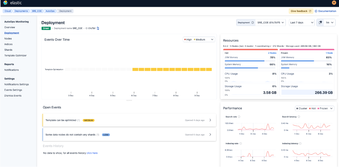 AutoOps는 Elastic Cloud 형태로 제공되는 Elastic Cluster 모니터링 Tools로 수백 가지 지표를 분석하여 Elasticsearch 문제의 진단, 근본 원인 분석 및 정확한 해결 경로를 제공합니다.