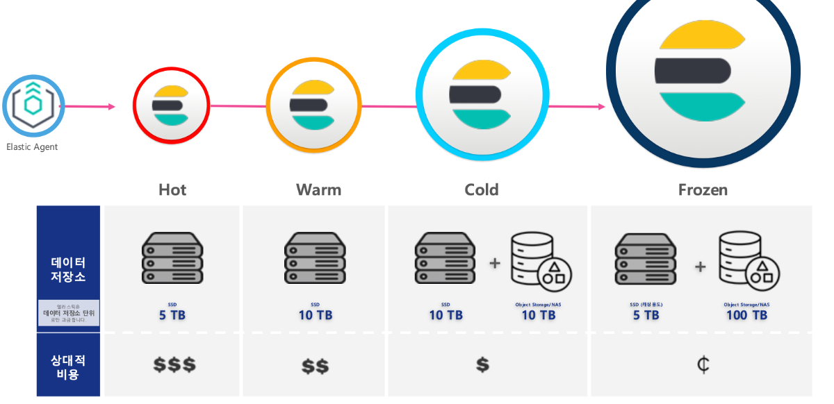 Cold 및 Frozen tier에서 제공되는 Searchable snapshot을 통하여, 비용 및 성능 측면에서 장기 데이터에 대한 효율적인 검색 및 분석을 가능하게 합니다.