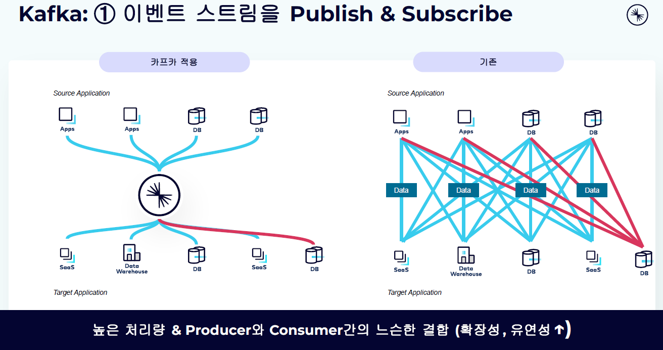 Kafka는 Producer와 Consumer를 분리하여 시스템 간 느슨한 결합(loose coupling) 구조를 제공합니다. 이 구조는 높은 처리량과 확장성을 가능하게 하며,애플리케이션 변경이나 확장 시에도 전체 시스템에 미치는 영향을 최소화합니다.