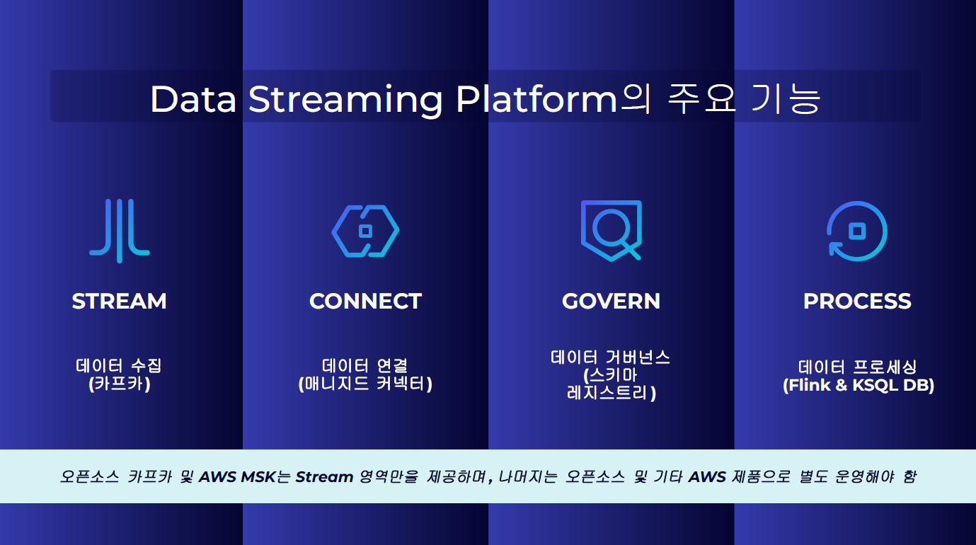 Kafka는 이벤트 스트리밍의 핵심 엔진이지만, 실제 운영 환경에서는 데이터 수집, 시스템 연계, 스키마 관리, 스트림 처리 등 다양한 구성 요소가 함께 필요합니다. 오픈소스 Kafka 또는 AWS MSK는 스트림 영역만 제공하며, 나머지 기능들은 별도의 오픈소스나 클라우드 서비스로 개별 구축·운영해야 하는 한계가 존재합니다.