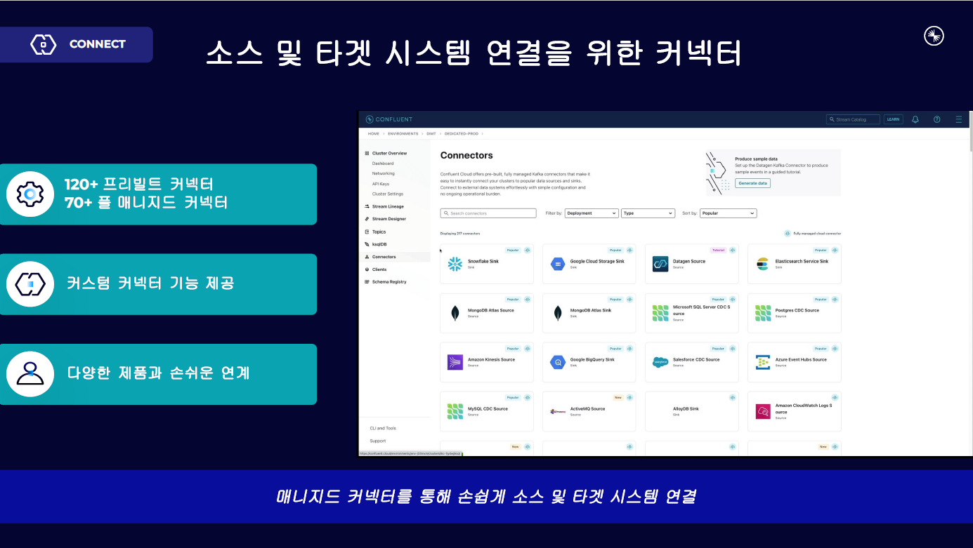 Confluent는 120개 이상의 프리빌트 커넥터와 70개 이상의 풀 매니지드 커넥터를 제공하여 다양한 시스템과 손쉽게 연계할 수 있습니다. 데이터 소스와 타겟 시스템을 코드 개발 없이 연결할 수 있어, 실시간 데이터 파이프라인 구축 시간을 획기적으로 단축합니다.