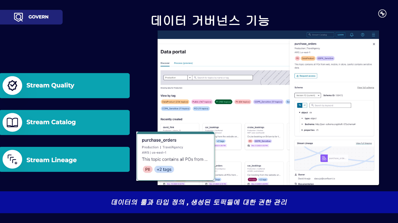 Confluent는 스키마 레지스트리 기반의 데이터 타입 관리, 토픽 단위 접근 제어, 데이터 품질 규칙을 통해 실시간 스트리밍 데이터에 대한 엔터프라이즈 거버넌스 체계를 제공합니다. 이를 통해 데이터 신뢰성과 규제 대응력을 동시에 확보할 수 있습니다.