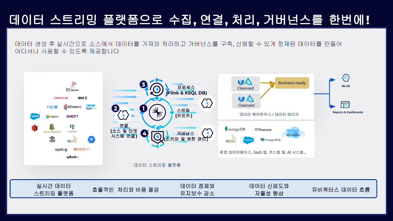엔터프라이즈 스트리밍 플랫폼은 단순한 메시지 브로커가 아니라, 데이터 수집(Connect), 데이터 처리(Process), 데이터 거버넌스(Govern) 기능이 통합되어야 합니다. Confluent는 Kafka를 중심으로 이 세 가지 영역을 하나의 플랫폼에서 제공하여, 데이터 흐름 전반을 일관되게 관리할 수 있도록 합니다.
