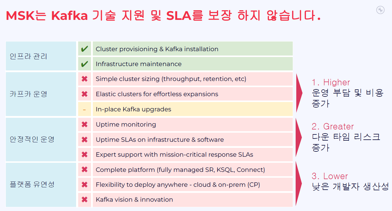 MSK는 Kafka 설치와 인프라 관리까지만 제공하며, Kafka 운영, 확장, SLA, 전문 기술 지원은 포함하지 않습니다. Confluent Cloud는 엔터프라이즈 SLA, 전문가 지원, 자동 확장, 무중단 업그레이드를 제공하여 미션 크리티컬 워크로드에 적합한 환경을 제공합니다.